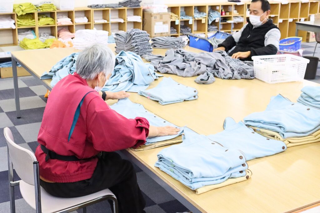 もう一つの柱が、クリーニング事業である。法人内には7カ所の高齢者入居施設があるため、入居者の衣類やバスタオルなどの洗濯を一手に引き受けている。さらに各施設で使うオムツの手配も、ワークセンターの役割だという。洗濯物やオムツ類──これらの管理だけでも膨大なスペースが必要なため、配送センターを独自に設け(従たる事業所)、洗濯物のたたみスペースやオムツの保管倉庫としている。