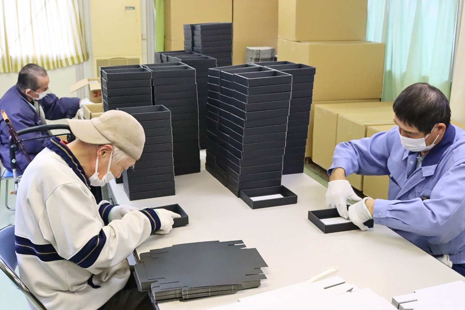 もう一つの柱が、クリーニング事業である。法人内には7カ所の高齢者入居施設があるため、入居者の衣類やバスタオルなどの洗濯を一手に引き受けている。さらに各施設で使うオムツの手配も、ワークセンターの役割だという。洗濯物やオムツ類──これらの管理だけでも膨大なスペースが必要なため、配送センターを独自に設け(従たる事業所)、洗濯物のたたみスペースやオムツの保管倉庫としている。